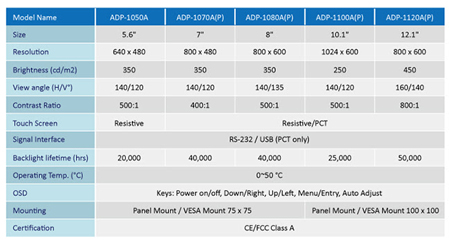 Associez vos opérations d’usine avec la série ADP-1XX0A : La série ADP-1XX0A est disponible en taille TFT-LCD 5.6", 7", 8", 10.1" et 12.1", supportant à la fois l’écran multi-tactile capacitif résistif et projeté. Avec la série ADP-1XX0A, vous pouvez surveiller un système d’exploitation dans sa globalité à des prix économiques et profiter d’un cycle de vie plus long du produit.