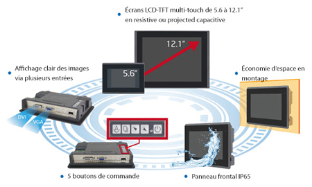 Il y a 1 port VGA et 1 port DVI pour l’entrée de signal d’images typiques dans l’industrie de l’automatisation industrielle, en particulier l’automatisation de traitement. De plus, 5 boutons de fonctions OSD sont présents à l’arrière des écrans : Marche / Arrêt, Bas / Droite, Haut / Gauche, Ajustement automatique et Menu / Entrée.