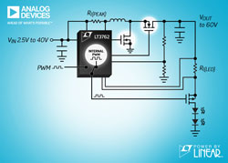Analog Devices annonce le LT3762 de Power by Linear™, un contrôleur de LED, sortie 60V, mode élévateur, synchrone, de rendement élevé, intégrant un générateur de signal PWM, programmable, pour le contrôle de LED et une modulation de fréquence avec étalement de spectre qui minimise le bruit dû aux EMI. Le LT3762, multi-usage, comprend un amplificateur de mesure de courant rail-à-rail, permettant la mesure du courant côté haut ou côté bas, qui, en plus du mode synchrone et élévateur, facilite la réalisation des conceptions avec des architectures en modes synchrones abaisseur et abaisseur-élévateur et en mode asynchrone SEPIC.