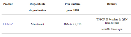 Le LT3762 est disponible en boîtiers, à performances thermiques renforcées, TSSOP de 28 broches et QFN, 4mm x 5mm. Il est disponible en trois classes de températures de fonctionnement, de –40°C à 125°C (jonction) pour les classes de températures industrielles et plus étendues, et une classe haute température de –40°C à 150°C.