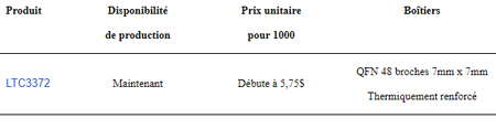 Le LTC3372 est disponible, en stock, en un boîtier QFN de 48 broches, 7mm x 7mm, à performances thermiques renforcées. Les classes E et I sont spécifiées pour fonctionner avec une température de jonction de –40°C à 125°C, et la classe H de –40°C à 150°C.