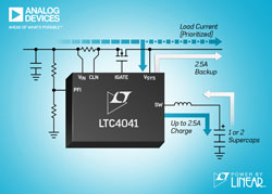 Analog Devices annonce le Power by Linear™ LTC4041, un système complet de gestion d’alimentation de sauvegarde à supercondensateurs, pour les systèmes à lignes d’alimentation, de 2,9V à 5,5V, qui doivent continuer à fonctionner en cas de défaillance majeure de l’alimentation. Les supercondensateurs emmagasinent plus d’énergie que les batteries, ce qui les rend appropriés aux systèmes qui requièrent une sauvegarde avec un pic de puissance élevé sur de courtes durées.