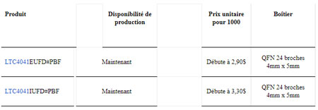 Consultez la page produit du LTC4041, téléchargez la feuille de caractéristiques, commandez des échantillons et cartes d’évaluation à : http://www.analog.com/LTC4041