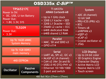 En plus de simplifier la conception d’un système embarqué, le C-SiP OSD335x est également environ 50% plus petit qu’un système équivalent construit avec des composants individuels. Cela permet aux ingénieurs de réduire leurs conceptions, d’économiser sur les coûts de leurs PCB ou d’ajouter de la puissance de traitement autant de possibilités qui n’étaient pas possibles jusqu’ici.
