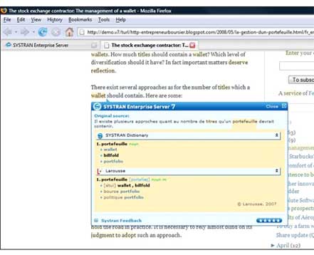 La nouvelle interface web de SYSTRAN 7 permet d’afficher dans une fenêtre contextuelle les alternatives de traduction proposées à partir des ressources SYSTRAN et LAROUSSE.