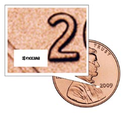 Avec sa tête thermique innovante, Kyocera s’avance vers de nouvelles dimensions. Cette très haute résolution de 4800 dpi permet d’imprimer 7,8 caractères sur une largeur d’un millimètre, et autorise d’imprimer de très importants volumes de données qu’il est possible de mémoriser par des codes bidimensionnels. Même des fichiers vidéo volumineux peuvent être ainsi cryptés sous forme de codes QR ou codes à barres 2D, un téléphone portable avec appareil photo associé au logiciel nécessaire étant susceptible de lire et de restituer ensuite ces fichiers vidéo. La capacité d’impression de signes d’une résolution infiniment petite, signes que l’oeil humain ne peut pas détecter et rend cette nouvelle tête thermique attractive surtout pour une application en matière de sécurité.