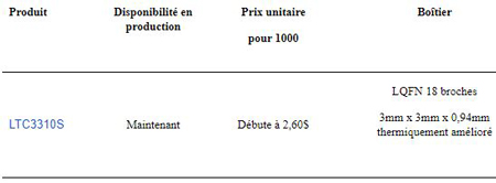 La durée de conduction minimale de 35ns du LTC3310S permet de réaliser une alimentation à taux de conversion élevé en mode abaisseur et à haute fréquence. Le fonctionnement avec un rapport cyclique de 100% permet un fonctionnement à faible chute de tension. La fréquence de fonctionnement peut être synchronisée sur une horloge externe. La précision totale de la tension de référence du LTC3310S est de ±1%, pour un fonctionnement sur la plage de température de jonction de –40°C à 125°C. Les caractéristiques supplémentaires comprennent un indicateur de tension régulée quand la tension de sortie est en régulation, un seuil précis pour la commande de démarrage, une protection contre les surtensions en sortie, une protection thermique, un gestionnaire de la température de la puce, une synchronisation à une horloge, une sélection de mode et une protection contre les courts-circuits en sortie. Le LTC3310S est disponible en un boîtier LQFN de 18 broches, 3mm × 3mm × 0,94mm, à performances thermiques renforcées. Les versions classes E et I sont spécifiées pour fonctionner sur une plage de température de jonction de –40°C à 125°C. Toutes les versions sont disponibles en stock.