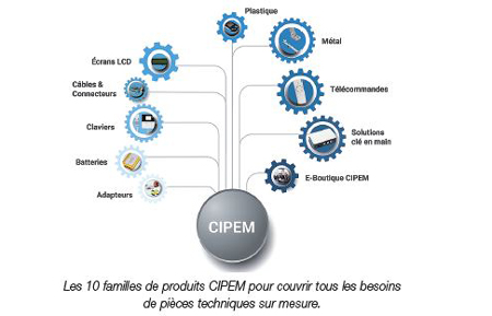 Les entités CIPEM proposent une large gamme de pièces techniques sur plan, des produits complémentaires à ICAPE. Les solutions proposées permettent d’apporter une offre globale sur tous besoins électroniques à l’échelle internationale, allant des câbles et connecteurs, aux afficheurs, aux batteries, etc…