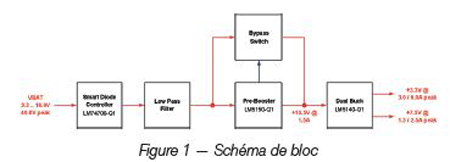 Les systèmes d’infodivertissement modernes cumulent plusieurs charges qui doivent être alimentées avec généralement deux tensions d’alimentation principales. Le schéma de référence décrit dans cet article présente un rail d’alimentation d’une tension de +3,3 V à 3,0 A (pic à 6,0 A) et un de +7,5 V à 1,5 A (pic à 2,5 A). Le rail de +3,3 V permet d’alimenter des charges comme le récepteur ou les microprocesseurs directement ou à l’aide de convertisseurs de point de charge basse tension. Quant à la chaîne de +7,5 V, elle sert notamment pour la tension de polarisation fantôme des microphones de kit mains libres et des dispositifs de réduction du bruit, les antennes actives (FM, AM, GPS, DAB), les caméras de recul ou les lecteurs de CD.