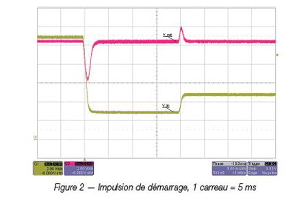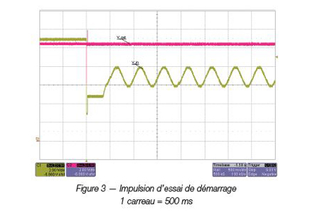 La figure 3 représente non seulement le début critique de l’impulsion d’essai, mais aussi la tension de batterie sinusoïdale dès que les moteurs du démarreur commencent à tourner. La tension de sortie est bien régulée à 10,5 V, sans la moindre perturbation.