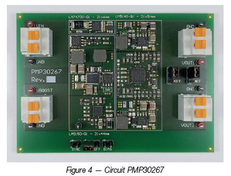 Deux convertisseurs Buck sont utilisés pour générer ces tensions de sortie. Ce dispositif fonctionne très bien en conditions normales, lorsque la tension de la batterie s’élève à quelque 12,0 V, mais aussi à basse température, lorsque la tension de la batterie chute au moment du démarrage du moteur (qui requiert une forte tension). Compte tenu de la présence de systèmes d’arrêt et de redémarrage automatique du moteur (start-stop) dans les voitures actuelles, cette chute de tension est susceptible de se produire non seulement au premier démarrage mais aussi à tout moment en trafic urbain. Les spécifications pour ces profils de tension de batterie varient et peuvent parfois descendre jusqu’à 3,2 V. Il est toutefois évident qu’avec une tension d’entrée si basse, les deux tensions de sortie ne peuvent être maintenues en recourant uniquement à des hacheurs série. Il faut donc installer un « convertisseur pré-boost » permettant d’alimenter les hacheurs avec une tension d’entrée suffisamment élevée pour maintenir les tensions de sortie à leur niveau prévu. Ce pré-boost n’a besoin d’être actif que lorsque la tension de la batterie chute en deçà d’un certain niveau ; dans le cas contraire il peut être contourné.