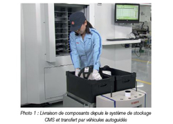 2. Dès la réception d’une information de changement de production, les composants sont livrés à partir du système de stockage CMS et transférés à des emplacements de changement de configuration arbitraires spécifiés grâce au lien, à l’aide de véhicules autoguidés, pour soulager l’opérateur (Photo 1) ;