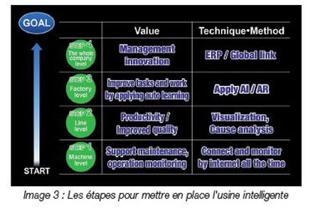 Yamaha Motor s’est rapidement approprié cette tendance et a mis au point « l’usine intelligente » : un système d’intégration Internet des objets (IoT) / machine-machine (M2M) (Image 2) utilisé dans les dernières technologies. Pour le lancement de l’usine intelligente, Yamaha Motor propose une procédure pratique en quatre étapes (Image 3). Tout d’abord, pour les étapes 1 et 2, l’entreprise se concentre sur l’automatisation et les économies de main d’oeuvre sur la ligne de production CMS, grâce à la connectivité machine-machine.