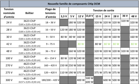Les nouveaux CHiP DCM 80 W affichent une très large plage de tension d’entrée allant de 9 V à 75 V et sont disponibles avec des tensions nominales de sortie de 12 V, 24 V et 48 V, avec une plage de régulation de tension de ±1 %.