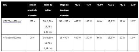 La nouvelle gamme d’alimentations conforme VITA 62 de Vicor Power Systems est conçue pour les systèmes Open VPX 3U et affiche une excellente efficacité et une densité de puissance inégalée dans un châssis durci refroidi par conduction. La gamme démarre avec des produits affichant une tension nominale d’entrée DC de 28 V ou 270 V, avec des tensions de sortie prédéfinies comprises entre 3,3 V et 12 V, fournissant jusqu’à 600 W de puissance. Les clients ayant besoin de tensions de sortie ou de niveaux de puissance différents peuvent demander une alimentation sur mesure répondant parfaitement à leurs propres exigences.