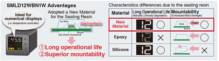 Pour résoudre ce problème, la SMLD12WBN1W utilise un nouveau matériau pour la résine d’étanchéité qui maintient une luminosité de 100 % pendant les essais de fonctionnement (25C, IF=20mA, 1 000 heures). Il en résulte une durée de vie environ 20 fois plus longue par rapport à la luminosité résiduelle montrée dans les mêmes conditions par des produits similaires disponibles sur le marché.