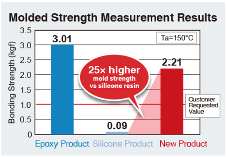 2. Résistance du boîtier 25 fois supérieure par rapport à l’utilisation de résine de silicone : Bien que la dégradation de l’intensité lumineuse puisse être améliorée en adoptant une résine de silicone, le détachement du moulage du substrat gagne en facilité. Il est impossible de faire appel à des mesures visant à améliorer la résistance de montage, comme l’ajout de réflecteurs aux LED compactes, et les dommages à la partie moulée demeurent un défi. L’utilisation d’un nouveau matériau en résine améliore de 25 fois la résistance au moulage par rapport aux produits à base de résine silicone, même à des températures élevées (Ta=150C). Ceci minimise les défauts lors du montage sur les circuits imprimés, pour une meilleure montabilité.