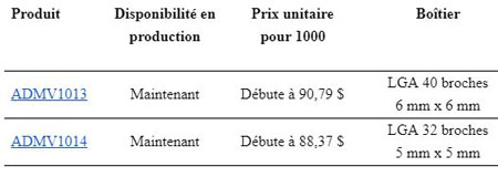 L’ADMV1013 est présenté en un boîtier LGA de 40 broches, 6 mm x 6 mm, et l’ADMV1014 dans un boîtier LGA de 32 broches, 5 mm x 5 mm. Échantillons et quantités en production sont disponibles immédiatement.