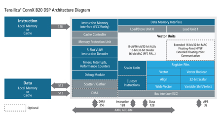 Compatible au niveau logiciel avec les autres membres de la famille ConnX (ConnX BBE16/32/64EP), le processeur ConnX B20 présente une largeur vectorielle de 512 bits jusqu’à 128 opérations MAC, peut charger 1024 bits de données par cycle, et atteint la fréquence de 1,4 GHz ou davantage en technologie 16 nm. Ces produits élargissent ainsi la famille ConnX, permettant d’adresser des besoins de performances encore plus variés. Par ailleurs, les clients disposent de nombreuses options d’accélération algorithmique pour réduire le nombre de cycles, à savoir une plus grande précision en opérations en virgule fixe 32 bits (y compris des opérations d’optimisation des fonctions MAC, FFT et FIR) avec support complexe, ou des opérations en virgule flottante vectorielle (VFPU) simple ou demi-précision, le débit en demi-précision étant deux fois plus élevé qu’en simple précision. Cette flexibilité permet, de choisir un niveau de précision supérieur seulement quand cela est nécessaire. En outre, une option VFPU (Virtual Floating Point Unit) étendue assure la prise en charge des opérations en virgule flottante natives complexes pour doubler les opérations en virgule flottante réelles avec la largeur de vecteur généralement utilisée dans les premières parties des chaînes de traitement radar. L’option « communications » accélère la correction d’erreur anticipée (FEC) dans les applications à bas débit en qute de solutions radio logicielles.