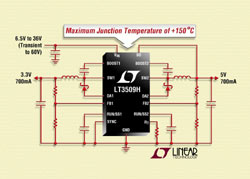 Chacun des canaux du LT3509 peut fournir, en sortie, un courant continu jusqu’à 700 mA, avec des rendements pouvant atteindre 88%. Sa gamme de tensions d’entrée étendue, de 3,6 V à 36 V, avec une protection contre les transitoires jusqu’à 60 V, le rend idéal pour la régulation de l’énergie provenant d’une grande variété de sources d’alimentation, incluant les transformateurs muraux non régulés, les alimentations 24 V de l’industrie et les batteries de l’automobile. Pour les applications de l’automobile, la tension minimale d’entrée de 3,6 V du LT3509 lui permet de fonctionner avec des tensions d’entrée extrêmes inférieures à 4 V requises pour les conditions de "démarrage à froid" de l’automobile. De la même façon, la tension d’entrée continue de 36 V du composant, avec la protection jusqu ‘à 60 V, lui permet de supporter les impulsions transitoires rencontrées dans les conditions de rupture de charge. La fréquence de commutation, de 300 kHz à 2,2 MHz, du LT3509 est programmable par l’utilisateur, lui permettant d’optimiser le rendement et d’utiliser des petits composants, de faible coût, inductances et condensateurs à diélectrique céramique, ce qui conduit à une faible ondulation prévisible en sortie.