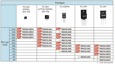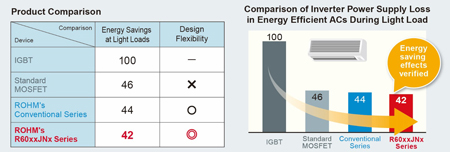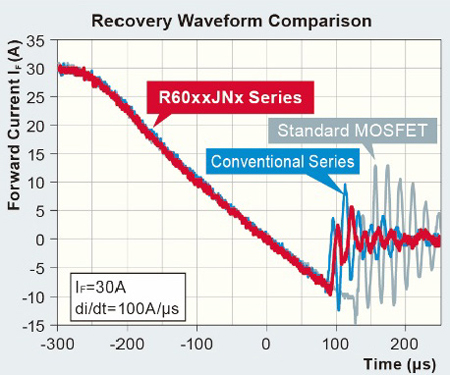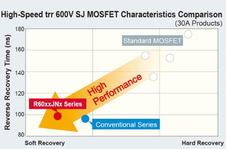 Pour répondre à ce besoin, ROHM a lancé en 2012 la série PrestoMOSTM de MOSFET de puissance. Cette série présente les caractéristiques de récupération inversée les plus rapides de l’industrie, réalisant ainsi une faible consommation de courant. Comme avec nos produits conventionnels, cette nouvelle série tire parti de notre technologie propriétaire de contrôle de la durée de vie pour obtenir des trr ultra-rapides. Cela permet de réduire la perte de puissance d’environ 58 % à des charges légères par rapport aux implémentations d’IGBT. De plus, augmenter la tension de référence nécessaire pour allumer le MOSFET empêche l’auto-allumage, qui est une des principales causes de pertes. De plus, l’optimisation des caractéristiques de la diode intégrée a permis d’améliorer l’indice de récupération progressive spécifique aux MOSFET à super-jonction, ce qui réduit le bruit pouvant provoquer des dysfonctionnements. L’élimination de ces obstacles à l’optimisation des circuits donne aux clients une plus grande souplesse de conception.