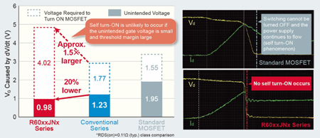 Les clés pour améliorer la flexibilité de conception L’augmentation de la vitesse de commutation, l’auto-allumage et la génération de bruit sont des phénomènes perturbants qui rendent nécessaire pour les clients d’optimiser les circuits en ajustant la résistance de la grille et d’autres facteurs pendant la conception du circuit. Contrairement aux MOSFET polyvalents, la série R60xxJNx de ROHM prend des mesures contre le bruit et l’auto-allumage, offrant aux clients une grande liberté de conception.