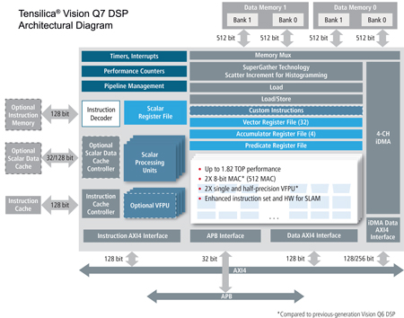 Concernant les applications d’intelligence artificielle, le processeur Vision Q7 assure une grande flexibilité avec 512 opérations MAC 8 bits, au lieu de 256 avec le Vision Q6. Pour de meilleures performances dans le domaine de l’intelligence artificielle, le DSP Vision Q7 peut tre associé au processeur Tensilica DNA 100. Outre ses performances de calcul élevées, ce nouveau processeur embarque un certain nombre d’améliorations iDMA (ADM en 3D, compression et interface AXI 256 bits). Le DSP Vision Q7 est un sur-ensemble du processeur Vision Q6 qui protège les investissements logiciels déjà effectués par les clients et facilite la migration à partir des processeurs Vision Q6 ou Vision P6.