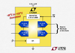 La petite taille du LTC2634 et la référence de tension interne sont des caractéristiques importantes pour une grande variété d’applications industrielles, de l’automobile et des applications ATE (Automated Test Equipement). En intégrant une référence de tension de 10 ppm/°C, le LTC2634 offre, en plus, une réduction de volume pour les cartes de circuit à surface réduite. Le LTC2634 présente une caractéristique de 12 bits, avec une erreur de non linéarité intégrale de ± 2,5 LSB (max.) et une diaphonie inférieure à 2,4 nV.s, assurant qu’un changement d’une tension d’un CNA produise un effet minimal sur les autres CNA. Fonctionnant sur une alimentation de 2,7 V à 5,5 V, la consommation est basse, de 125 µA par CNA.