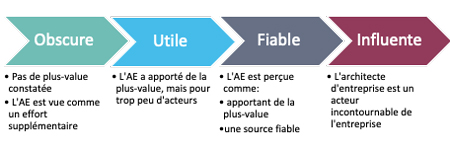 Cette tendance est confirmée par une enquête du Gartner qui révèle que « 77 % des personnes interrogées ont soit redémarré ou renouvelé leurs efforts en matière d’Architecture d’Entreprise (18 %), soit entrepris pour la première fois des initiatives en matière d’Architecture d’Entreprise (34 %), soit porté leurs efforts au niveau supérieur (25 %) ». Pour aller plus loin il existe des mesures proactives à mettre en place qui permettent d’accélérer et d’améliorer vos pratiques d’architecture d’entreprise. Avant d’être générateur de valeur, la démarche d’Architecture d’Entreprise évolue et passe par plusieurs étapes au sein de l’organisation :