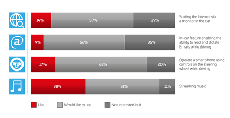 Entouré d’un large éventail d’appareils grand-public, comme des smartphones que l’on peut personnaliser par le biais d’applications, les consommateurs attendent le même genre d’expérience du système multimédia de leur voiture. Avec l’éventualité de voir les systèmes d’aide à la conduite prendre en charge une partie du stress de la conduite, une enquête consommateurs menée par Accenture a montré un certain intérêt pour la possibilité de surfer sur Internet, de lire ou de dicter des courriels, et de "streamer" (lire en live un contenu provenant d’un site web) de la musique, tout en conduisant.