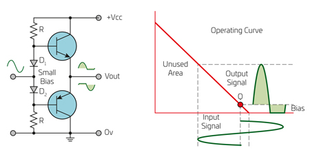 Les amplificateurs Classe AB surmontent les limites de rendement des amplificateurs Classe A, tout en réduisant la distorsion de croisement inhérente aux amplificateurs Classe B. Cependant, comme cette topologie fait fonctionner les transistors dans leur région linéaire, il y a une limite au rendement que l’on peut atteindre.
