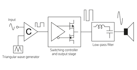 Les topologies Classe D utilisent des signaux numériques PWM (Pulse Width Modulation, ou modulation de largeur d’impulsion) pour reproduire la sortie analogique souhaitée. Cela se traduit par un rendement beaucoup plus élevé, puisque le fonctionnement de l’étage de sortie n’est pas limité à sa seule région linéaire. La sortie passe par un filtre LC, qui ne transmet que les fréquences audibles du signal audio aux haut-parleurs, en excluant les composantes haute-fréquence des impulsions numériques PWM.