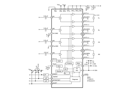 Les avantages de la topologie Classe TB sautent aux yeux quand on implémente un amplificateur audio utilisant le Toshiba TCB701FNG. Le dispositif fournit quatre canaux audio, délivrant 49W d’audio haut-rendement de grande qualité, avec une distorsion THD (Total Harmonic Distortion, ou distorsion harmonique totale) de 0.02%, et plusieurs fonctions de diagnostic intégrées. Sa robustesse inhérente contre les parasites électromagnétiques réduit également le nombre de composants externes nécessaires, de même que l’absence de filtre LC.