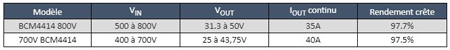 Ce nouveau module 800V vient en renfort du module BCM4414 700V de Vicor, pour constituer une famille de produits à tension d’isolation élevée (4.242V continu) et conversion de tension bidirectionnelle. Ces modules BCM peuvent facilement être connectés en parallèle pour plus de puissance, et leurs sorties SELV peuvent être connectées en série pour obtenir une tension de sortie supérieure. Ces deux modules BCM se présentent en boîtier VIA™ (Vicor Integrated Adapter) de 111 x 36 x 9,3 mm, intégrant la communication PMBus™, le filtrage EMI et la protection contre les transitoires de tension. La forme plane du boîtier VIA simplifie la gestion thermique et l’interfaçage avec un large éventail de technologies de refroidissement