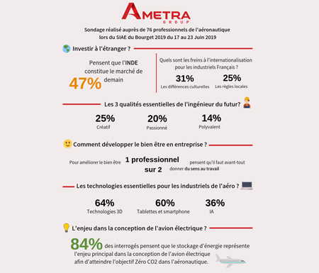 Lors du 53e salon International de l’Aéronautique et de l’Espace au Bourget du 17 juin au 23 juin, le groupe Ametra, champion industriel français dans les secteurs de l’aéronautique et de la défense, est parti à la rencontre de 76 professionnels du secteur pour évoquer les problématiques industrielles de demain : la conquête de nouveaux marchés à l’international, le recrutement des talents, la transition digitale et le développement de la responsabilité sociétale des entreprises.