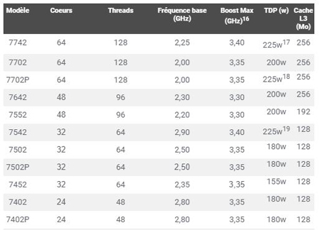 Des performances de pointe : proposant jusqu’à 64 cœurs « Zen 2 » par SOC, les processeurs EPYC de deuxième génération délivrent jusqu’à 23% plus d’instructions par cycle d’horloge (IPC) par cœur sur les charges de travail serveurs13 et jusqu’à 4 fois plus de Cache L3 comparativement à la génération précédente,