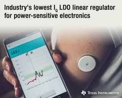 Texas Instruments (TI) lance un régulateur linéaire à faible chute de tension (LDO) et ultra-basse consommation, au courant de repos (IQ) le plus faible du secteur moins de 25 nA soit un dixième des dispositifs ultra-miniature de la concurrence. Le nouveau régulateur affiche un faible contrôle d’IQà faibles charges, même en conditions de chute de tension, permettant aux ingénieurs de doubler, au minimum, la durée de vie de la batterie de leurs applications. Il fournit en outre une excellente réponse transitoire pour un réveil plus rapide, améliorant ainsi les temps de réponse et les performances dynamiques des applications. Son faible encombrement permet aux ingénieurs de concevoir rapidement des produits plus petits, plus légers et plus efficaces en réduisant la taille de la solution d’alimentation. Les boîtiers industriels courants assurent pour leur part un remplacement direct de broche à broche dans les conceptions existantes.