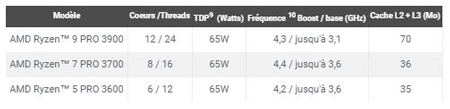 Les processeurs AMD Ryzen 9 PRO 3900, AMD Ryzen 7 PRO 3700 et AMD Ryzen 5 PRO 3600 sont basés sur l’architecture la plus avancée au monde, à savoir l’architecture « Zen 2 » en 7 nm. Ils sont conçus pour s’adapter à pratiquement tous les contextes professionnels et propulsent des systèmes polyvalents signés HP et Lenovo. Offrant jusqu’à 12 cœurs et 24 threads avec le AMD Ryzen 9 PRO 3900, soit la configuration multicoeurs la plus importante pour un processeur professionnel1, les nouveaux processeurs s’appuient sur une conception haute performance et sur une efficacité élevée parfaites pour les environnements professionnels les plus rigoureux. Ils disposent par ailleurs d’un rendement énergétique supérieur pour des performances sans compromis.