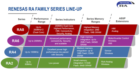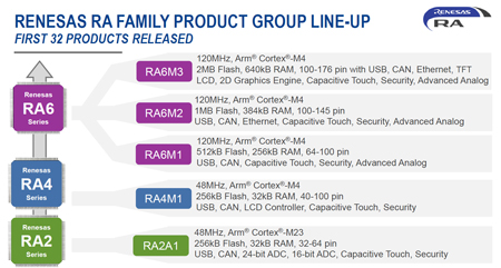 Les cinq premiers groupes de MCU RA disponibles, aujourd’hui, sont composés de 32 MCU évolutifs avec des cœurs Arm Cortex-M4 et Cortex-M23. Ils disposent d’un nombre de broches de 32 à 176 broches, de 256 Ko à 2 Mo de mémoire flash, de 32 à 640 Ko de mémoire SRAM et de solution de connectivité comme l’USB, le bus CAN et l’Ethernet. Il est facile de changer de MCU au sein de la famille RA grâce à la compatibilité des fonctions et des broches. Chaque groupe de MCU RA offre des performances supérieures en termes de consommation électrique, en mode actif et en mode veille, ainsi que des fonctions améliorées comme la technologie de touche tactile capacitive de Renesas qui est très appréciée.