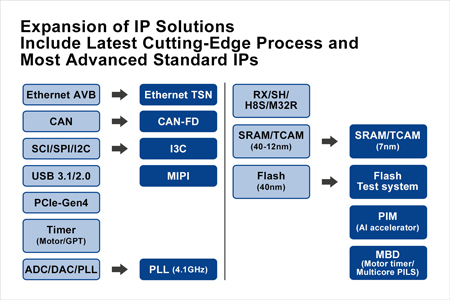 En septembre 2018, Renesas a ouvert son vaste portefeuille de licences IP, offrant un accès à plus de 40 licences, y compris des cœurs de processeur, des IP compteurs pour les applications moteur, des cœurs USB et des mémoires SRAM. En 2019, Renesas a reçu plus de 100 demandes de renseignements et a commencé à fournir des IP à de nombreux utilisateurs. Renesas vise à dépasser le taux de croissance du marché annuel des ventes d’IP de 10% et étendra la fourniture de la propriété intellectuelle et du système de support tout en créant de nouveaux, et étendant les anciens marchés d’IP.