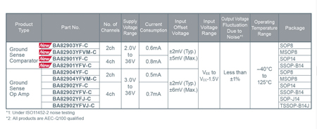 3. Répondre aux exigences automobiles internationales : La série BA8290xYxxx-C est conforme aux normes de fiabilité automobile AEC-Q100 et réduit à la fois la consommation de courant (0,6 mA vs 0,8 mA) et la tension d’offset (±5 mV vs ±7 mV) par rapport à des produits conventionnels. De plus, une large gamme est offerte dans une variété de boîtiers à montage en surface courants et de nombres de canaux avec une disposition standard des broches de comparateur, facilitant le remplacement des produits existants dans les applications sensibles au bruit.