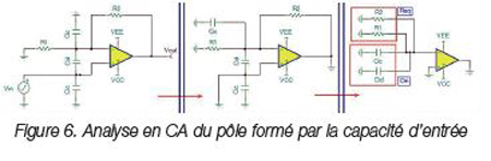 La Figure 6a illustre les capacités d’entrée d’un amplificateur non-inverseur, qui forme un pôle dans le chemin de contre-réaction, lequel modifie le ROC. Les ingénieurs oublient souvent ce pôle lorsqu’ils conçoivent des circuits ; or, il peut provoquer des problèmes de stabilité.