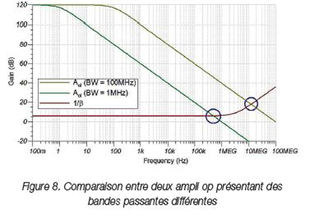 La fréquence du pôle créé par Req et Cin est indépendante de la bande passante en boucle ouverte de l’ampli op. Par conséquent, les ampli op qui présentent un produit gain-bande plus élevé sont plus sujets aux problèmes de stabilités provoqués par la capacité d’entrée. C’est ce que montre la Figure 8, qui représente le tracé des courbes Aol de deux ampli op hypothétiques : l’un avec une bande passante de 1 MHz (courbe verte), l’autre avec une bande passante de 100 MHz (courbe jaune). Si les deux amplificateurs présentent la même courbe 1/β, il s’ensuit que le circuit à bande passante plus élevée présente une courbe Aol qui rencontrera la courbe 1/β après la fréquence du pôle formé par la capacité d’entrée. Pour le même circuit, avec un ampli op à bande passante plus faible, l’intersection se fera avant la fréquence du pôle, avec une marge de phase supérieure à 45 degrés.