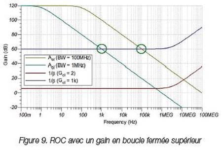 Un circuit présentant un gain plus élevé est moins sujet aux instabilités, comme le montre la Figure 9 qui représente deux courbes 1/β possibles : l’une à 6 dB, l’autre à 60 dB. Aucun des ampli op n’est affecté par le pôle créé par la capacité d’entrée lorsque le gain est élevé.