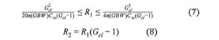 Un pôle ou un zéro commence à impacter la phase d’un système une décade avant la fréquence de coupure. Même si fp_cin n’est que légèrement supérieur à BWCL, il impactera la marge de phase du gain en boucle. Mieux vaut donc que fp_cin soit entre 2 et 10 fois supérieur à BWCL. Pour un circuit non-inverseur, utilisez l’équation 2 comme contrainte pour le ratio entre R1 et R2, et adaptez l’équation 5. Puis, résolvez celle-ci pour R1 et R2 de sorte que fp_cin soit entre 2 et 10 fois supérieur à BWCL.