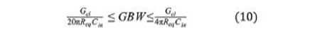 Vous pouvez également adapter l’équation 5 afin de trouver le produit gain-bande admissible le plus élevé pour une valeur Req donnée. Toujours en conservant, comme recommandé, une valeur de fp_cin entre 2 et 10 fois supérieure à BWCL, l’équation 10 permet de calculer une plage de produit gain-bande passante :