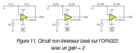 Les équations 7 et 8 vous aideront à choisir l’amplitude des résistances de contre-réaction :