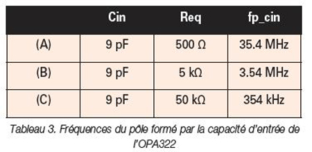 Utilisez l’équation 5 afin de calculer la fréquence du pôle créé par la capacité d’entrée et la résistance du circuit de contre-réaction (sans tenir compte de capacité parasite). Dans tous les cas, Cin est identique. Le Tableau 3 présente la fréquence de pôle calculée pour chaque cas.