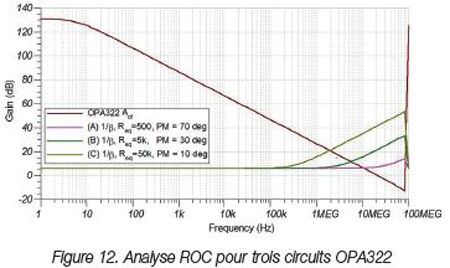 Si l’on applique l’équation 5, le circuit à gain élevé présentera une fréquence de pôle près de cinq fois plus élevée que le circuit à faible gain.