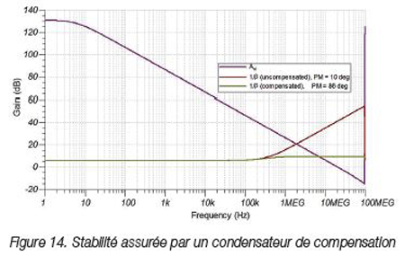 La Figure 14 compare le circuit non compensé à sa version compensée, et montre que le condensateur joue bien son rôle de stabilisation. L’analyse de stabilité du circuit non compensé donne une marge de phase de 10 degrés. Avec le condensateur de compensation CF, elle passe à 86 degrés.